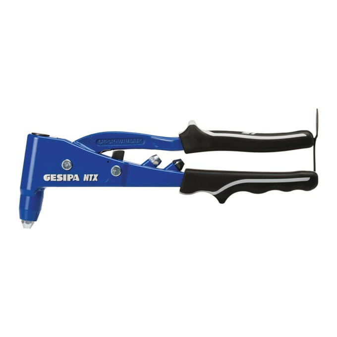 Z wysokogatunkowego ciśnieniowego odlewu aluminiowego, szczęki kute ze stali chromowo-wanadowej. Wąska główka kleszczy umożliwia pracę w miejscach trudnodostępnych. System pośredniej dźwigni redukuje wydatek siły podczas pracy. Prosta i szybka wymiana końcówek. Nitownica z poręcznymi uchwytami kołnierzowymi i klamrą zabezpieczającą.